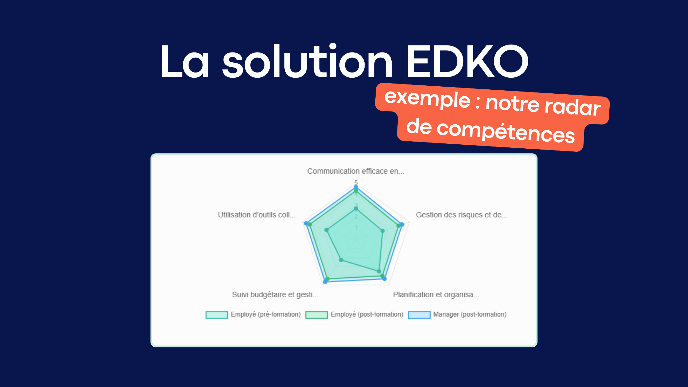 Edko automatise la mesure à chaque niveau avec des indicateurs actionnables : NPS, Radar de compétences, Score de Mise en Application (SMA), Indice d'Impact Edko (IIE).